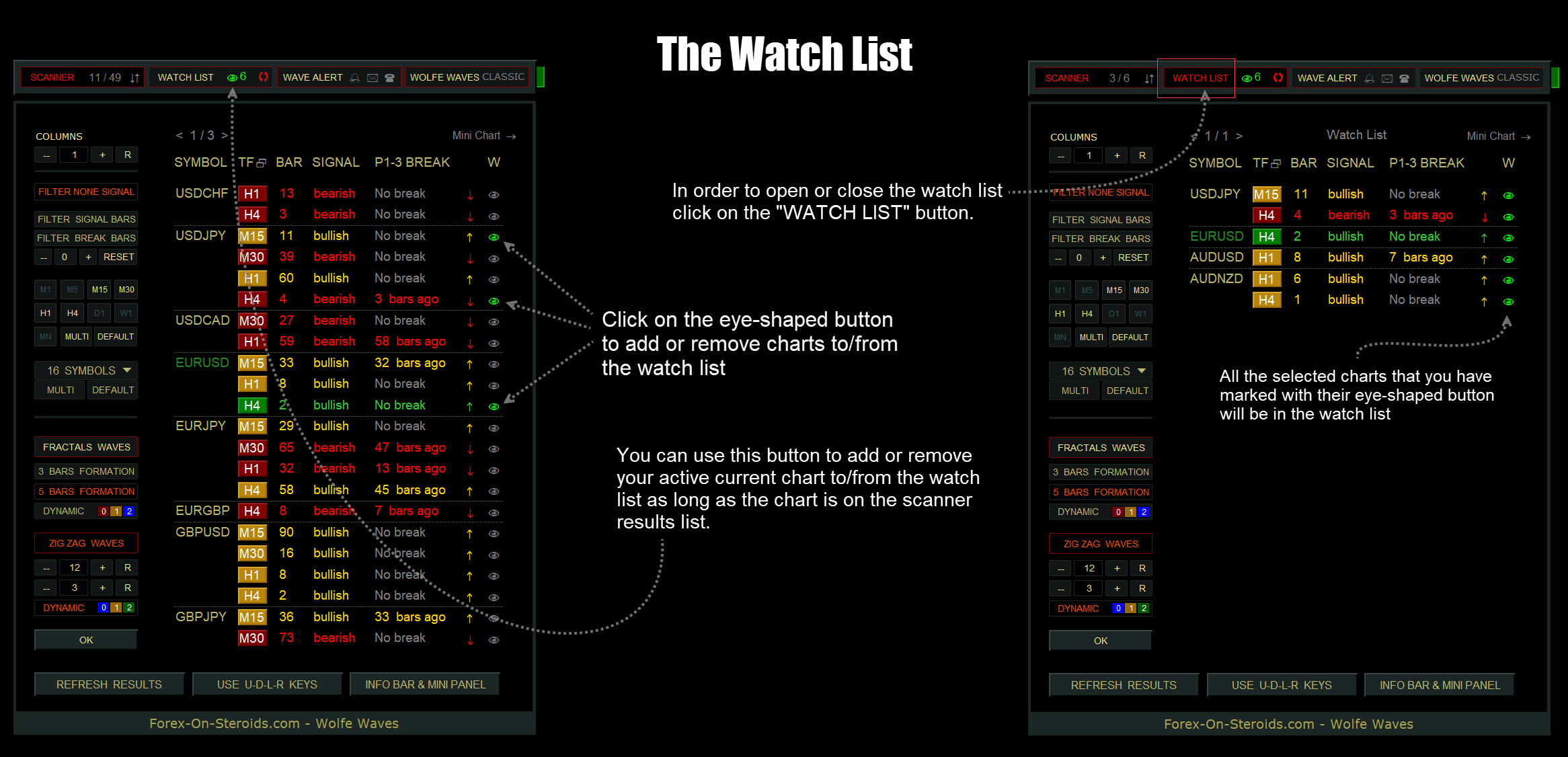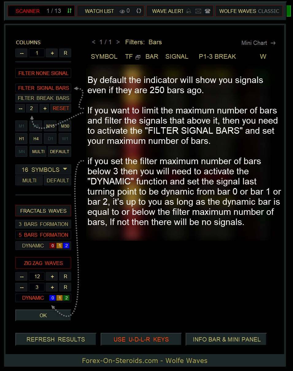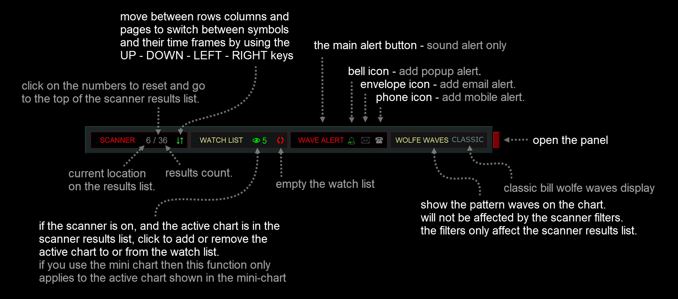 The Wolfe Waves Scanner displays all detected Wolfe Waves on one convenient panel.
